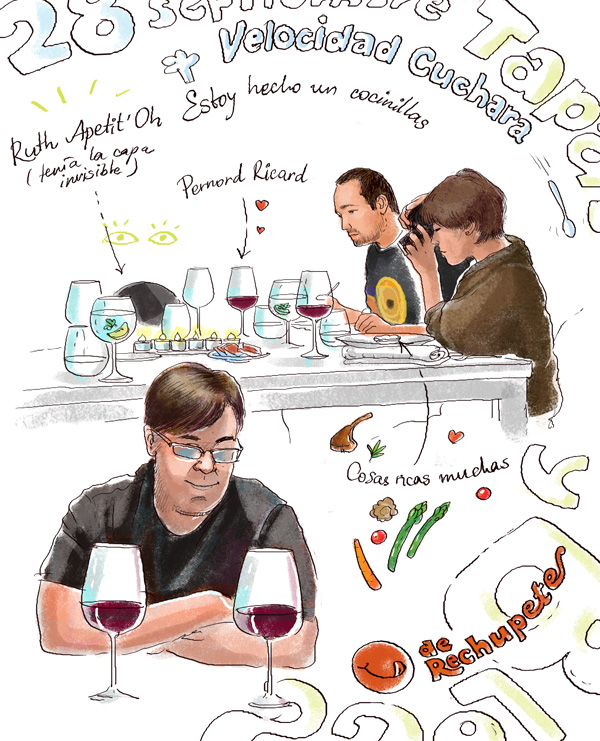 Mejor tarde.. dicen:) Tarde, pero llegó. Y cómo iba yo a quedarme tranquila, sin mencionar ese martes de gentes, artes y gastronomía.. el 28 de Septiembre. Teníamos todos ganas de volver a vermos, me parece. Aunque a menor escala, ya que se echaron de menos muchas caras. Y yo, que llegaba con mis ánimos acelerados de mis dibujiencuentros y con la alegría de ver a los Tapasbloguers, entre la emoción sólo recuerdo haber hablado en grandes cantidades y reído lo mismo o más.